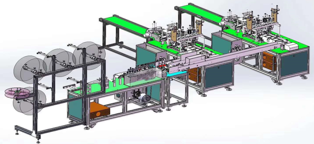 7.該生產(chǎn)線可配合口罩自動(dòng)包裝線使用,實(shí)現(xiàn)從材料—成品—包裝的全程無(wú)人化運(yùn)行。