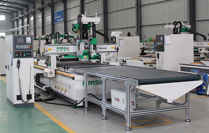 木工加工中心加排鉆是在標準加工中心加排鉆開料機的基礎(chǔ)上增加自動上下料功能,給機器加裝了一套能夠自動抓料的兩個手臂、一個上料放板平臺和自動傳送下料平臺。機器在加工過程中實現(xiàn)自動化加工,為家具廠生產(chǎn)降低了人工勞動強度,提高產(chǎn)量。